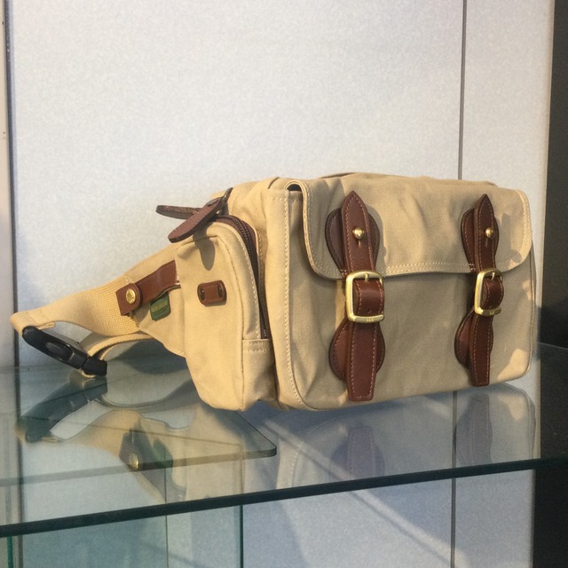 丈夫で柔軟性があり、風合いを楽しめる9号帆布。 強力なパラフィン加工を施し、強力な撥水性を持ちながら通気性も確保しています。 使い込むほどに風合いが増し、味わい深くなるのが魅力。天然素材の風合いを愉しみつつ、ご愛用いただけます。 前面のマチ付きフラップポケットの内側には、3つのオープンポケット。小物類の整理に役立ちます。 両サイドにはマチ付きファスナーポケットを装備。厚みのある小物類もしっかり収納できます。 ウエストベルト部のレザーはホックと面ファスナー付き。このレザー部分に、お手持ちのキーホルダーやカラビナなどを装着することができます。 ポケットが多いので、釣りやキャンプ、ウォーキングなどのアウトドアにもおすすめです。 【サイズ(約)】 縦16.5×横25×マチ9cm (サイドポケット含んだ横幅31cm・フロントポケット含んだ厚み13cm) ウエスト周り:70~117cm 重量:590g 【素材】 帆布(コットン100% 強力パラフィン加工)×牛革 【仕様】 外装:サイドファスナーポケット×2、前面フラップポケット×1、背面ファスナーポケット×1 内装:オープンポケット×3(フロントポケット内)、ファスナーポケット×1、メッシュオープンポケット×1 【カラー】 ベージュ 内側:カーキグリーン