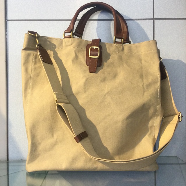 丈夫で柔軟性があり、風合いを楽しめる9号帆布。 強力なパラフィン加工を施し、強力な撥水性を持ちながら通気性も確保しています。 使い込むほどに風合いが増し、味わい深くなるのが魅力。天然素材の風合いを愉しみつつ、ご愛用いただけます。 メインコンパートメント前後にあおりポケット。フロント側のあおりポケット内に仕切られた小ポケットがあり、小物を分けて入れるのに便利。 底部はクッション素材を内側に配し、さらにクロスステッチを施しています。重たい荷物を入れても型崩れしにくいのが嬉しいポイント。 ファスナースライダーは鍵付きなので、安心して荷物を運ぶことができます。 カジュアルすぎずフォーマルすぎず、ジャケパンにもスーツにも合わせられる上品なバッグです。 【サイズ(約)】 縦27×横38×マチ6.5cm 持ち手:29cm ショルダーストラップ:90~144cm(取外可) 重量:850g 【素材】 帆布(コットン100% 強力パラフィン加工)×牛革 【仕様】 外装:前面オープンポケット×1、背面オープンポケット×1 内装:メッシュオープンポケット×4(フロントポケット内)、ファスナーポケット×1、メッシュホックポケット×1 【カラー】 ベージュ 内側:カーキグリーン