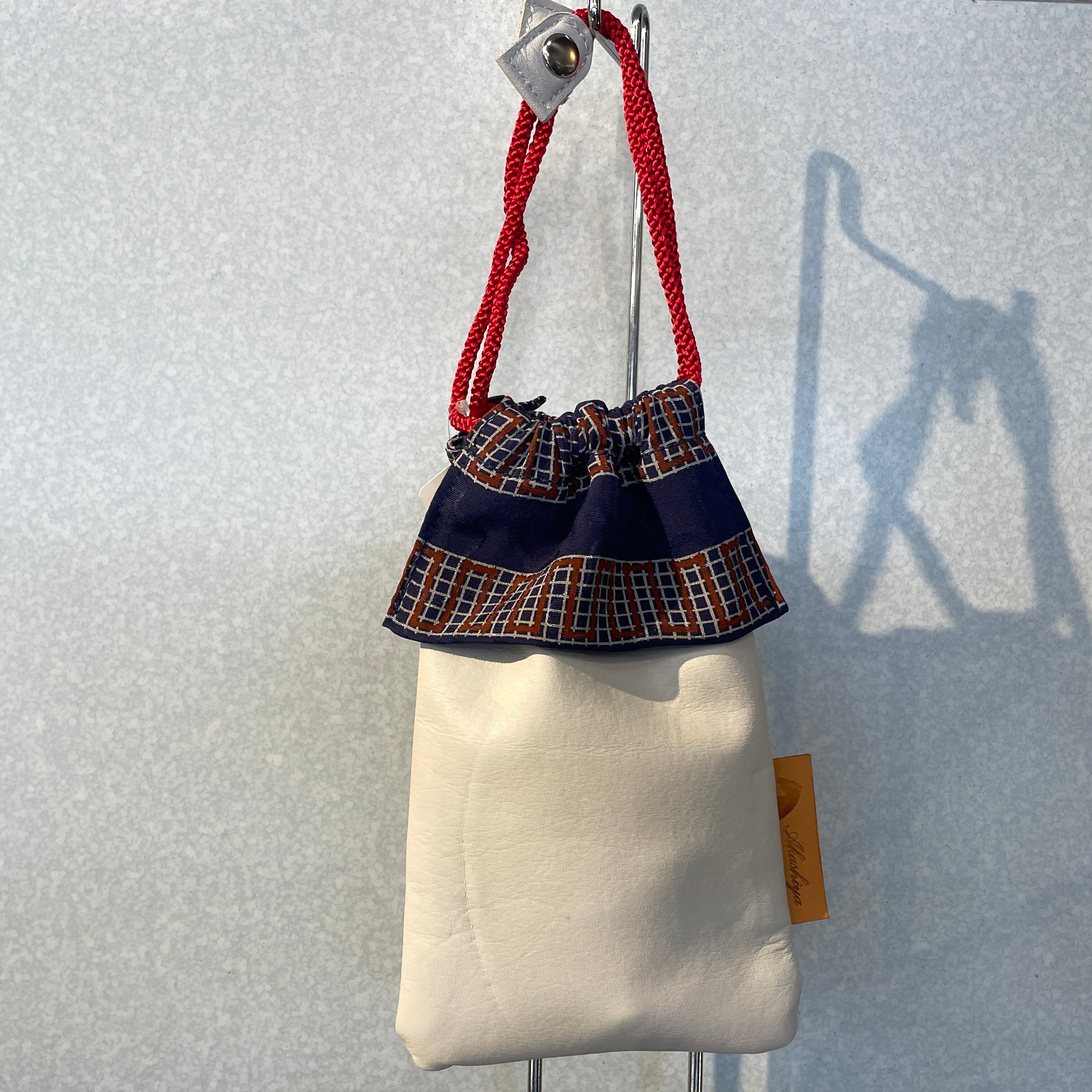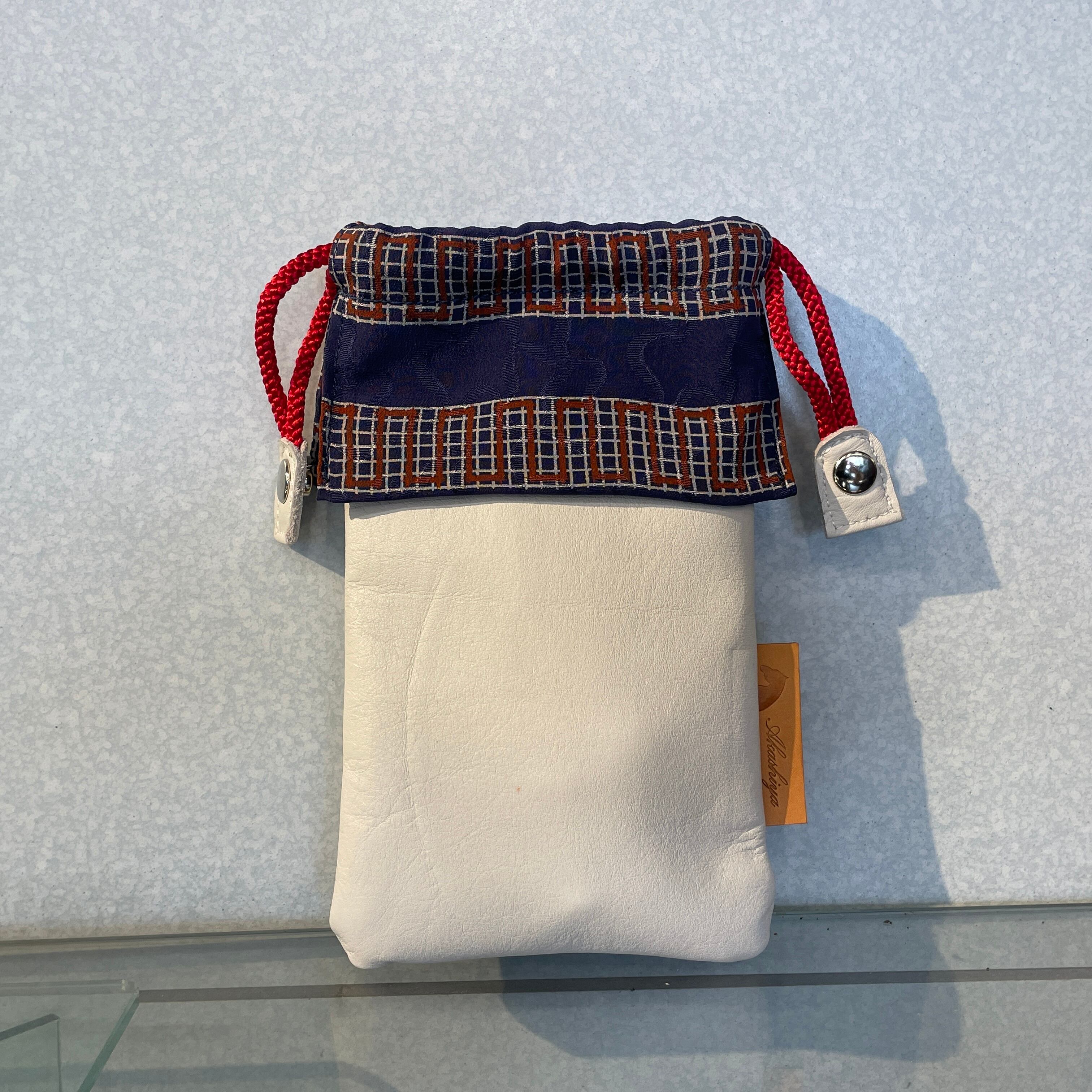 着物柄と牛革を組み合わせた巾着型のスマホポシェットです。