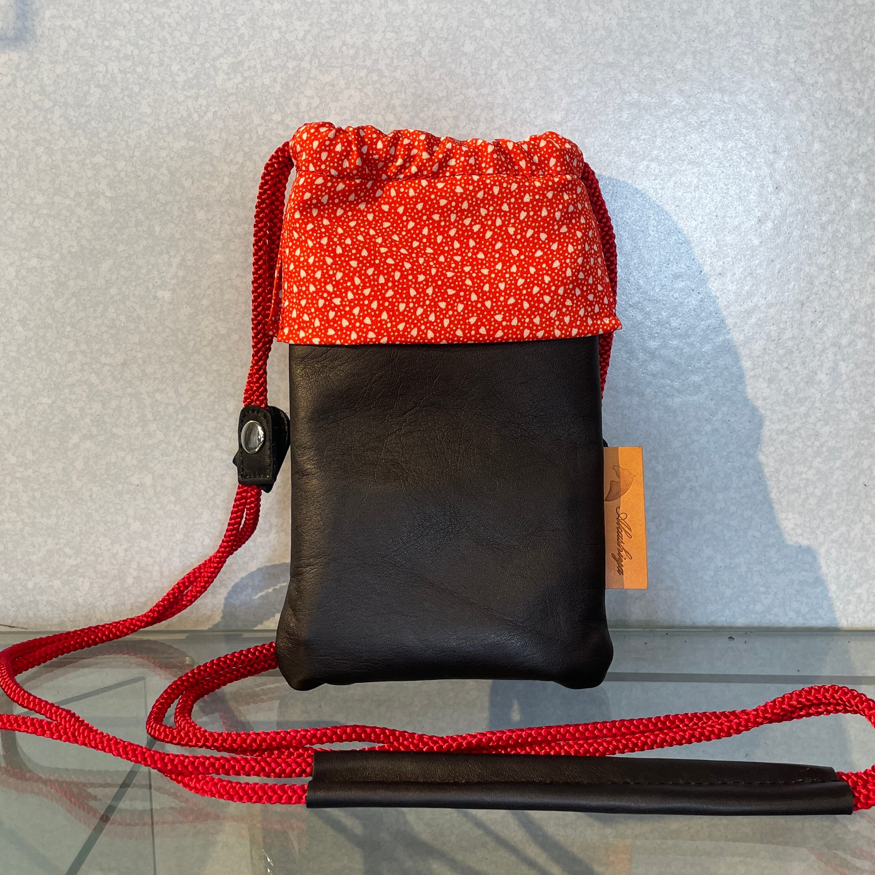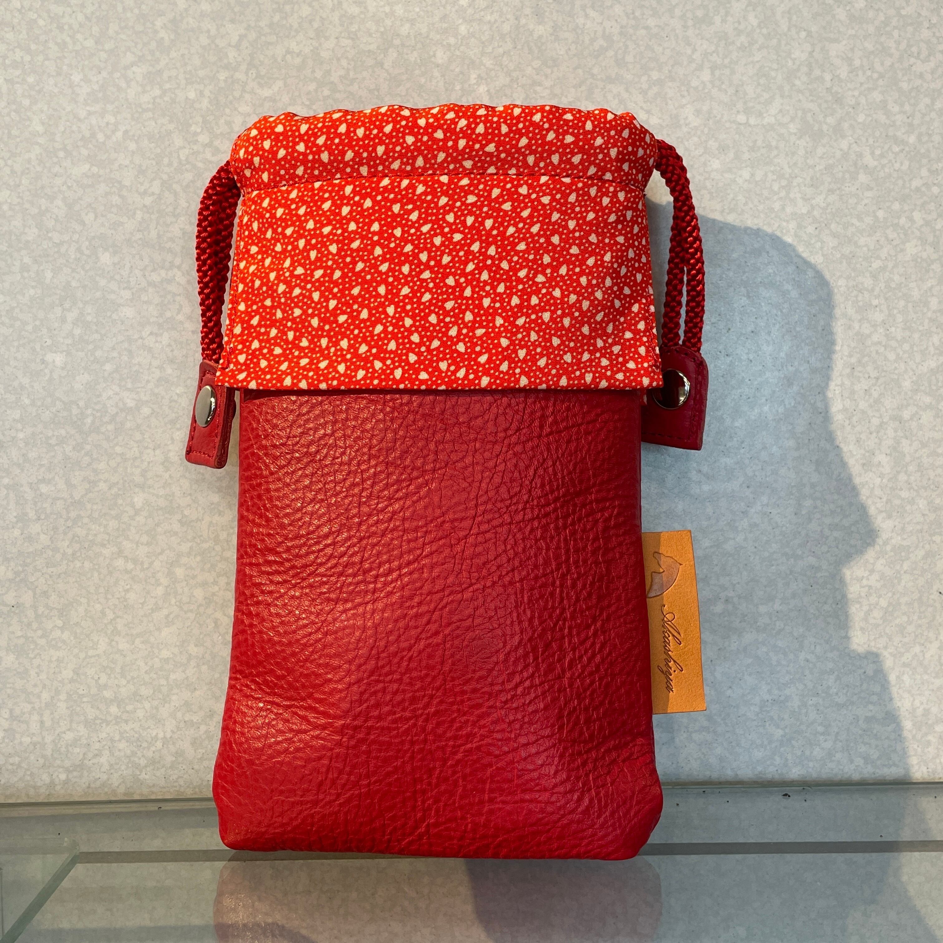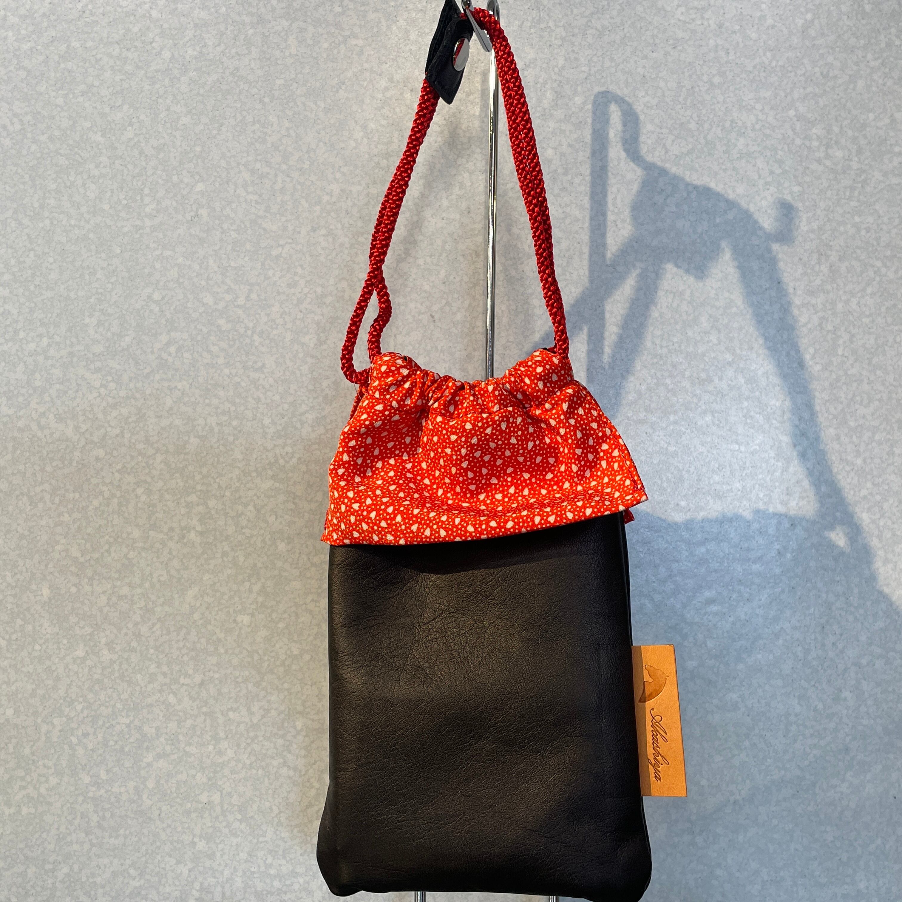 着物柄と牛革を組み合わせた巾着型のスマホポシェットです。