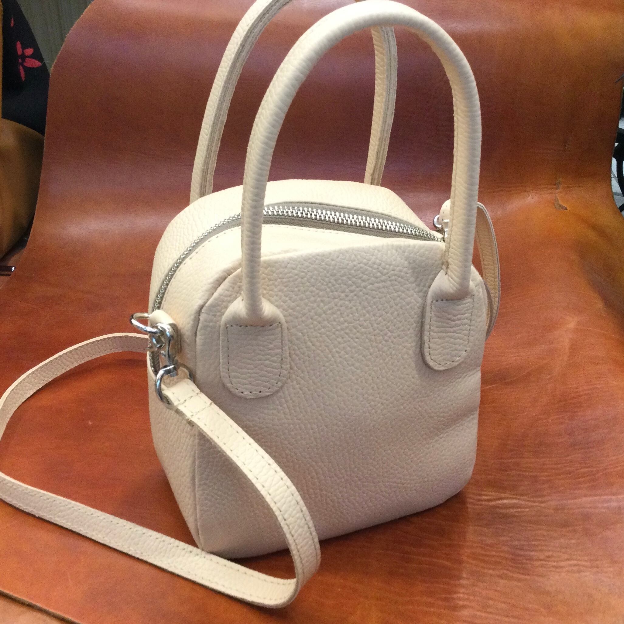 コロンとした形が可愛いダイス(サイコロ)型のミニトートに取り外し可能なショルダーベルトを付けました。